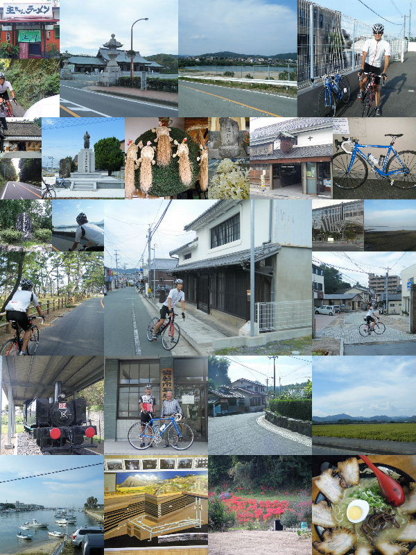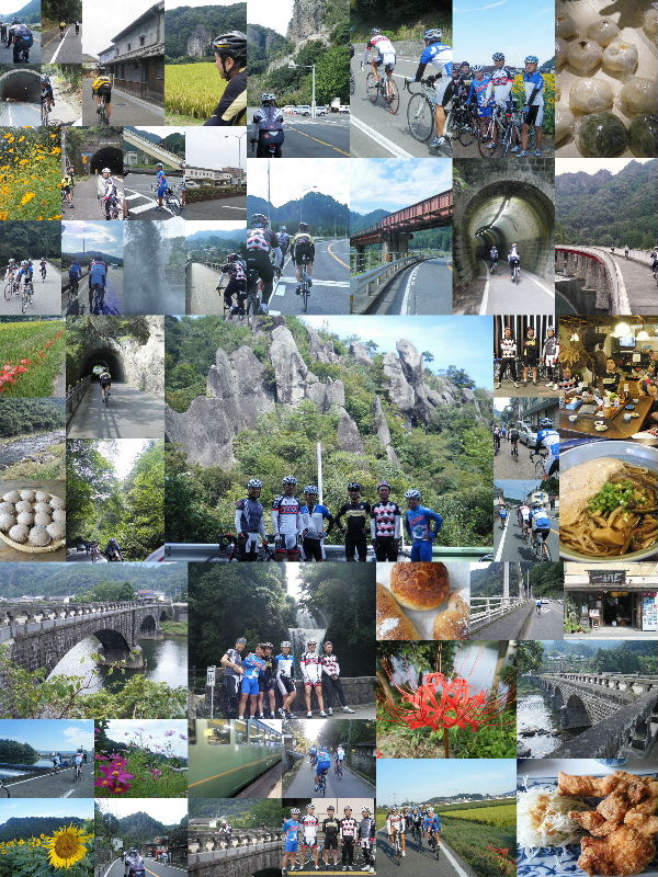 日が短くなり山岳の下りは寒くなります。ウインドブレーカーとライトの携帯をお忘れなく! 10月2日(日) 唐津観光 唐津銀行 愛郷ファーム 集合時間:7:30 集合場所:島巡り橋サニー前 途中合流の方 8:30 ポプラ 有田店(西九州自動車道側道) 二丈~浜崎~唐津銀行~愛郷ファーム~唐津~~二丈 食事は 愛郷ファーム のハンバーグを予定しています。 オール平地の唐津・呼子の観光サイクリングです。初心者の方もどうぞ。 10月5日(水) 旧長崎街道 筑前六宿巡り 再リベンジ 集合時間:6:00 集合場所 博多駅 博多口(輪行) 鹿児島本線 準快速 博多発 6:45 古賀発 7:06 小倉着 8:08 小倉城 常盤橋~黒崎宿~木屋瀬宿~飯塚宿~内野宿~旧冷水峠~山家宿~原田宿 旧街道を正確にトレースします。(道が無くなってるところはスルーします。) 食事は行き当たりばったりです。 10月9日(日) 遊の谷 地鶏グルメ 北野町コスモス街道 集合時間:7:30 集合場所:城南区樋井川 島廻橋サニー ~南畑ダム~東背振トンネル~吉野ヶ里~城島町~八女市~遊の谷~ 広川町~北野町コスモス街道~今村天主堂~小郡~大宰府~ 背振山系を越え、筑後川を渡り、絶品の地鶏を味わいます。 秋の風物詩コスモスの咲く道の先に今村天主堂の尖塔が見えてくるドラマチックなサイクリング? です。 秋を感じるサイクリングをどうぞ。 10月16日(日) 秋月 江川ダム 清流館収穫祭 集合時間:7:30 集合場所:島巡り橋サニー前 ~大宰府~旧博多街道~秋月~江川ダム~寺内ダム~旧博多街道 昼食のたかき清流館は、収穫祭で大賑わい。恒例のバイキング料理です。 10月22日(土) 有田輪行 磁器の里を散策(その2) 集合時間:7:30 集合場所:島巡り橋サニー前 途中合流の方 202号線高速高架ぞい有田中央交差点 ポプラ前原有田店 で8:30 ~二丈~鏡山~佐里~県道38号~山内バイパス~有田~伊万里(輪行) 帰りの電車代は伊万里から1,500円くらいです。 泉山磁石場 トンバイ塀 陶山神社 柿右衛門窯 チャインオンザパーク など 昼食は、ギャラリー有田 の予定です。 10月30日(日) 肥前濱宿(佐賀県鹿島市)輪行 集合時間:7:30 集合場所:島巡り橋サニー前 ~三瀬峠~川上峡~佐賀~牛津町~鹿島~白石~大川~柳川 (西鉄柳川駅より輪行) 川上峡の元祖吉野屋さんで「白玉饅頭」休憩 佐賀神社近くの鶴の堂本舗さんで「豚まん」休憩 小城市 牛津町の 牛津赤れんが館 牛津町会館 を見学 肥前浜宿の酒蔵通りを散策の予定です。食事は鹿島で有明海の珍味を予定しています。 平成23年9月25日(日曜日) 天候 晴 時々 曇り 距離 約185Km (帰り輪行 博多駅から自宅までの距離を含む) 最高高度 約505m サイクリングの 詳細は こらち 写真をダウンロードしたい方は こちら シルバーウイークのトリを飾るひさびさのロングラン。耶馬溪へ。景勝を楽しみ蕎麦や唐揚を味わい、旅を満喫しました。 いつもより早く6時に集合して出発。旧街道で筑紫野路から朝倉路へ。杷木町のひまわり畑で休憩。夜明ダムサイドを快調に飛ばし天領日田へ。三隈川から玖珠川へ遡り、天ヶ瀬温泉で休憩。お馴染みの「一番列車」で椎茸饅頭を味わい出発。温泉街を抜け慈恩の滝へ。滝見物の後、急坂を上がり玖珠高原へ。高原は一足先に秋本番。豊後森から深耶馬溪へ。峠の茶屋で蕎麦饅頭を味わった後、豪快な下り。耶馬溪特有の絶景と緑のカーテン。走りを満喫した後は一見八景で昼食。美味しい蕎麦に舌鼓。耶馬溪ダムを下った所で、自走組とお別れ。輪行組は耶馬溪鉄道跡のサイクリングロードで本耶馬溪へ。石橋、絶景、青の洞門、中津名物の唐揚・・・楽しみ尽して帰路へ。山国川に沿って国道212号線を遡り、最後の難関、大石峠を越え天領日田へ。日田から輪行で博多へ。長くて楽しい一日でした。 初秋の耶馬溪を 見て 味わって 走って 満喫!自走組の方、220Km走破お疲れ様でした。RIDE AND SMILE