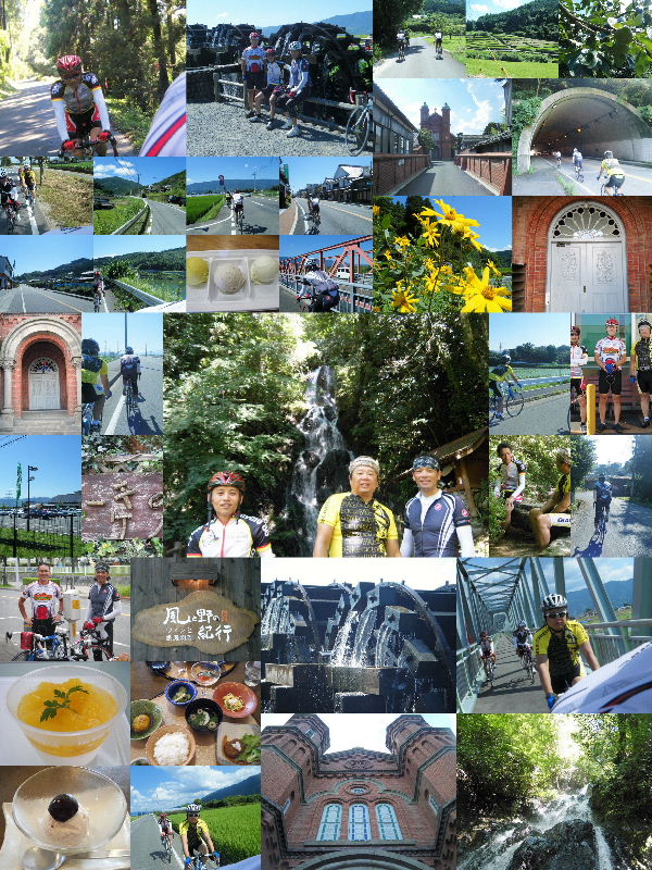 台風一過の天候不順により中止しました。 梨カレーと梨ジュースを楽しみにしていた皆さん、又の機会をお楽しみに。 平成23年8月28日(日曜日) 天候 晴れ 距離 約130Km 最高高度 約315m サイクリングの 詳細は こらち 写真をダウンロードしたい方は こちら 雨続きで2週間ぶりのサイクリング。今日は朝倉路を抜け耳納連山の調音の滝で涼を感じるサイクリングの予定でしたが、帰路が灼熱地獄。暑さに耐えて戻ってきました。 穏やかな朝。爽やかにサイクリングです。二日市を抜け、秋月へ抜ける旧道を気持ちよく走ります。稲穂が頭を垂れ、大豆畑の新緑が眩しいです。国道386号線バイパスを進みます。丘を越えトンネルを抜け一路朝倉路へ。水路沿いの水車を見て三連水車の里「あさくら」で休憩。お目当ての朝倉アイスと肉まんを頂きました。筑後川を渡り吉井の白壁の町並みを抜け、いよいよ合瀬耳納峠への上りです。新しくダムが出来た辺りは遮るものがなく、直接日差しを受けますが、山間に差し掛かると鬱蒼とした林を抜け、棚田や山間の村を見ながら暫く走ると調音の滝に到着。夏休み最後の日曜日。家族連れで超賑わい。こんな山の中!滝は天然のクーラー。小川で体を冷まし出発。耳納連山の麓を走り山苞の道へ。道沿いの葡萄園や無花果園は最盛期。柿はたわわに。でも残暑厳しく、日陰を走るとほっとします。「風と野の紀行」で昼食。心のこもった家庭料理に癒されて帰るのが億劫になりました。デザートの巨砲のジェラートは絶品の舌触りでした。山苞の道を後に田圃を抜け筑後川を渡り太刀洗の今村天主堂を見学。あいにく教会行事が行われていたので中は見れませんでしたが。灼熱の県道53号線を北へ。暑さにひたすら耐えました。針摺のケーキのケンプで最後の休憩をして元気に戻ってきました。 夏休み最後の日曜日、朝倉から耳納連山へサイクリング。調音の滝で涼を楽しみ、耳納の豊かな自然の恵みを体感しました。RIDE AND SMILE
