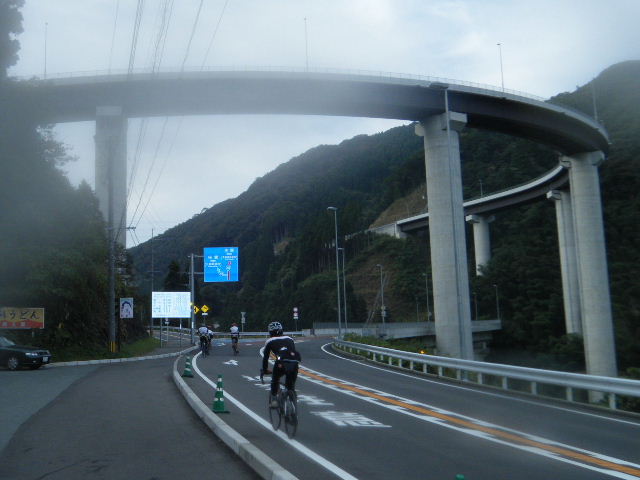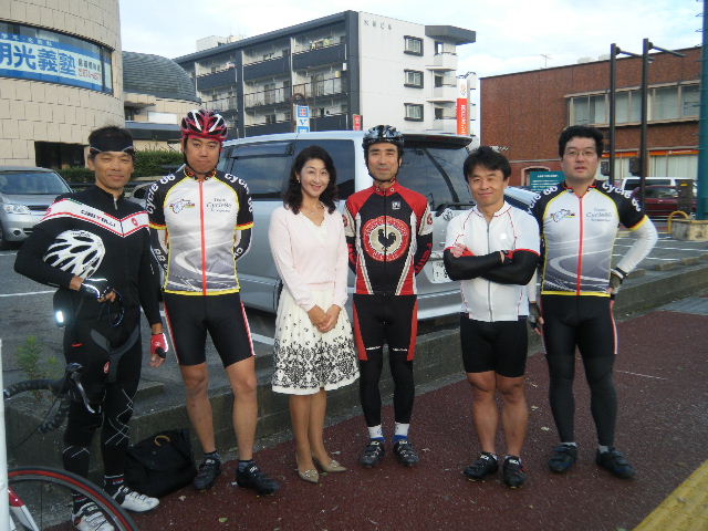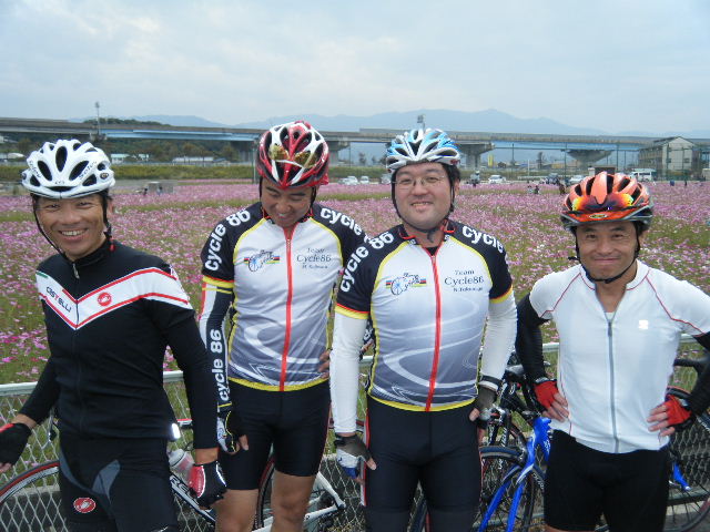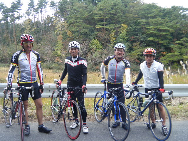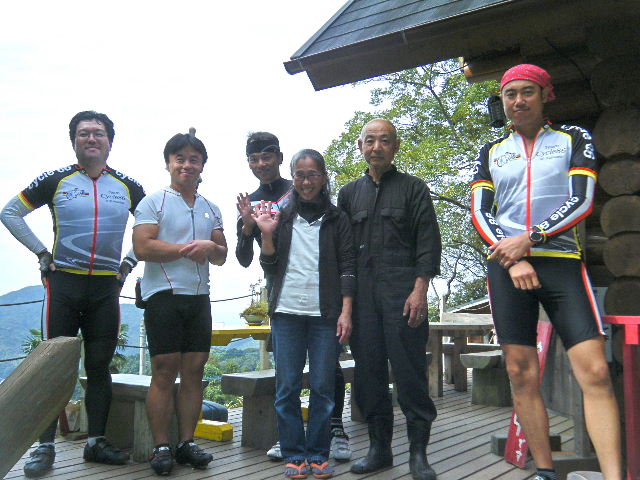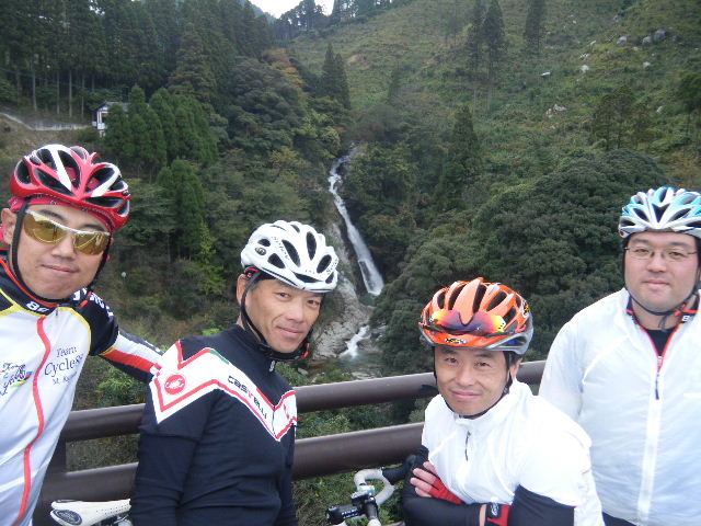 でも、寒さ対策が必要になってきますよ。ウインドブレーカーや長指グラブ、日が短くなりますのでライト類もお忘れなく! 今月は山で紅葉を楽しむのと、今からが旬の牡蠣を味わうサイクリングを企画しました。ご検討下さい。 11月1日(日) Erovice Special 長崎街道を往く 集合時間:05:30 集合場所:博多駅筑紫口 途中合流の方 08:00 集合場所:島巡り橋サニー前 その他の詳細は 長崎街道サイクリング を参照して下さい。 11月8日(日) 猫峠 飯塚観光 大野越え 集合時間:7:30 集合場所:島巡り橋サニー前 ~篠栗~呑山観音~猫峠~八木山展望台~旧伊藤伝右衛門邸~嘉穂劇場~大野越え~篠栗~ 猫峠・八木山展望台・大野越え で山と紅葉を楽しみましょう。 また、篠栗の呑山観音。飯塚では、石炭王 旧伊藤伝右衛門邸と嘉穂劇場を観光します。 昼食は嘉穂劇場の真前、若鳥 で予定しています。 11月15日(日) 朝倉三連水車 今村天主堂 集合時間:7:30 集合場所:島巡り橋サニー前 ~大宰府~旧唐津街道~朝倉三連水車~北野町コスモス街道~今村天主堂 秋の風物詩コスモスの咲く道の先に今村天主堂の尖塔が見えてくるドラマチックなサイクリング? です。ほとんど平地ですが、少し距離があるかも。140Km位 秋を感じるサイクリングをどうぞ。 昼食は来てのお楽しみです。 途中合流の方 5号線近く大佐野交差点前のセブンイレブン 8時30分 11月22日(日) 紅葉の耶馬溪サイクリング 集合時間:6:00 集合場所:島巡り橋サニー前 途中合流の方 大佐野 セブンイレブン 7:00 JR利用の方 集合時間:8:45 集合場所 博多駅博多口 運賃¥3,740 JR特急ゆふいんの森1号 博多駅 9:16発 豊後森駅 11:00着 ~大宰府~朝倉~日田~玖珠(豊後森)~深耶馬溪~本耶馬溪~コアやまくに~日田(輪行) 輪行組と自走組は豊後森駅で合流(11:00)して、耶馬溪サイクリングを楽しみます。 一見八景の紅葉は見事でしょうね。楽しみです。 帰りは日田から輪行です。時間があれば日田豆田町の散策も。 帰りの電車 JR特急ゆふいんの森6号 日田駅 18:00発 博多駅 19:15着 運賃 ¥2,820 (2枚切符・4枚切符の利用で更にお安くなると思います。) 耶馬溪サイクリングに参加の方はコメントで書き込みお願いします。 行きは、自走かJRかも知らせて下さい。 11月29日(日) 糸島 牡蠣食うサイクリング 集合時間: 途中合流の方 202号線 今宿大塚 交差点 ~今宿~糸島~秘密の場所~今宿~ 牡蠣を味わうサイクリングです。牡蠣小屋のオープン時間に合わせて出発します。 (秘密の場所は、ひまわり畑でしたが、残念ながら先日刈り取られましたので中止です。) 集合時間が変わるかも知れません。確定したらお知らせします。 平成21年10月25日(日曜日) 神様の視線でサイクリングを見てみたい方は、 こちら 天候 曇り 参加 5 名 走行距離 約 95 Km 最高標高 606 m いつもの場所に、いつもの時間、集合しました。 本日の参加は5名です。 サイクル姫が集合場所に来てくれました。 スタミナドリンクと補給食の差し入れです。 姫、どうも有難うございます。次はぜひサイクリングにもご参加下さい。 最初の峠、三瀬に向けてペースを守り登ります。途中休憩するも、夏と違い汗が直ぐに引き、体が冷えます。休憩もそこそこに出発です。ループ橋から旧道経由で峠の頂きを目指します。峠の頂付近はちらほら紅葉が始まってるみたいです。 三瀬峠を下り、北山ダム沿いに進みます。途中から広域農道を通り突き当たりの国道を右折して七山方面を走ります。観音峠の手前を左折して亀岳を登ります。本日の最高標高606mです。山頂付近の勾配がキツクやっとの思いで登り、少し下ると・・・何故か山頂なのに沼や池です。橿原湿原に到着です。 橿原湿原から急坂を下ること15分。観音の滝に到着です。下りは寒くウインドブレーカーが必要になってきました。 今日は夏の賑やかさが嘘のようです。でも山間のダイナミックな滝を独り占めできて良い気分です。 観音の滝より下り国道に出た後、一旦唐津方向へ下り、川を渡り右折して、白木峠を目指します。白木峠の上り口より少し上がった見晴らしの良い高台に「燻や」があります。こちらでしばしの休憩です。ここは自家製のソーセージを使ったフランスパンのホットドッグガお勧めです。お好みでサルサソースもどうぞ。 燻やで休憩した後は、坂を黙々と登り、七山ゴルフ場を越えると白木峠の頂は間もなくです。七山から福吉に至る道を七福街道と呼んでいます。七山側から白木峠を下ると、山間から福吉漁港と玄界灘が見渡せ、なめらかな路面と相まって最高に気持ちよい下りです。 お昼になりお腹も空きました。今日の昼食は七福街道にある「日向の郷」です。 気さくなご主人と奥様、毎回自転車で来る私たちに呆れた様子。でも一緒に写真に写って頂きました。ご馳走様。またお邪魔しま~す。 食事の後、七福街道を福吉まで下り、突き当たりの202号線を福岡方向へ右折です。 海岸線の道を先頭交代しながら高速で福岡を目指します。途中より西九州自動車道の側道を走ります。周船寺辺りでしょうか。休耕