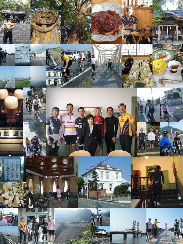 × [PR]上記の広告は3ヶ月以上新規記事投稿のないブログに表示されています。新しい記事を書く事で広告が消えます。 平成23年10月9日(日曜日) 天候 曇り のち 晴れ 距離 約150Km 最高高度 約444m サイクリングの 詳細は こらち 写真をダウンロードしたい方は こちら 今日は八女の遊の谷で絶品地鶏料理サイクリングの予定でしたが、ハプニングで予定変更。大川市を散策、帰りに背振山系の麓、綾部神社に参拝して名物のぼたもちを頂いて帰ってきました。 秋も深まり、早朝は肌寒くなってきました。定刻に出発。ウオーミングアップを兼ねて萩ノ原峠を越え那珂川町へ。コチラで1名合流して中ノ島公園へ。トイレ休憩の後、再出発。急坂を上り南畑ダムへ。筑紫耶馬溪の渓谷に沿って更に上り、東背振トンネルを抜け吉野ヶ里町へ。残念ながら朝靄で筑後平野の雄大な眺めを楽しむことはできませんでした。長い坂を下り、平野を疾走して筑後川へ。六五郎橋を渡った所で事件発生。自転車同士が接触した拍子に前輪がバースト。八方手を尽くしたのですが・・・タイヤの穴が大きく複数あり、結局修理を諦め、久留米のサイクルショップへ買出しに。修理と買出しで2時間半程掛かってしまいました。今回は、時間の関係で「遊の谷」は諦め大川散策に予定変更。筑後川に沿って大川市へ。老舗の料亭三川屋で昼食。近くの昇開橋を見物。再び筑後川に沿って戻り、清力美術館を見物。「立木美江」画伯の個展が開催中。本人から絵画の説明を受け、ちゃっかり記念撮影も。大川を後に筑後川を渡り帰路へ。背振山系の麓、綾部神社で休憩。参拝して名物のぼた餅を頂きました。鳥栖筑紫野道路を疾走するも筑紫野市からは、いつもの大渋滞。安全運転で帰ってきました。 秋の一日。ハプニングがハプニングを呼び・・・予定を変更したおかげで立木画伯とお会いすることができました。出会いに感謝ですネ。トラブッた時、皆で一致団結して対応。今日はフレンドシップと大川散策で RIDE AND SMILE ! 立木美江 画伯のホームページは コチラ PR