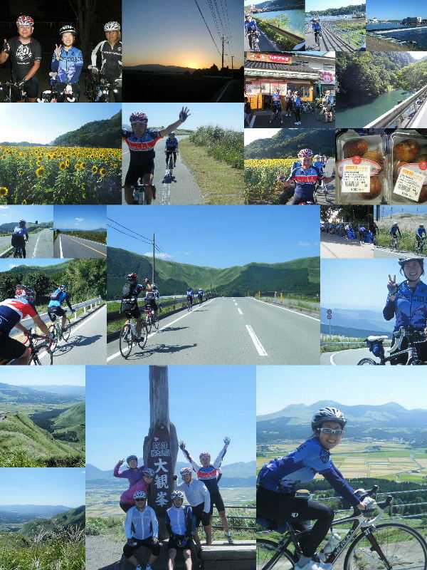 × [PR]上記の広告は3ヶ月以上新規記事投稿のないブログに表示されています。新しい記事を書く事で広告が消えます。 平成25年9月16日(月曜日:敬老の日) 天候 晴れ 距離 約170Km 最高高度 約970m サイクリングの 詳細は こらち 写真をダウンロードしたい方は こちら 9月16日敬老の日 三連休の最終日に阿蘇大観峰サイクリングで秋の一日を楽しみました。今回は指向を変えて、行きを高速バスひのくに号で熊本まで輪行。武蔵ヶ丘より豊後街道を西進、阿蘇の唯一外輪山が欠けている立野を経由して赤水よりミルクロードを上り、狩尾峠(ラピュタの道)、阿蘇スカイライン経由で大観峰へ。帰りは小国 杖立温泉 大山 日田を経由して博多へ戻る約170kmのコースでチャレンジしました。 午前6時博多駅集合。スムーズに輪行の準備を完了させてバスターミナルへ移動。出発5分程前にトランクへ自転車の詰め込み指示。バスでの輪行が初めてなので要領掴めずモタモタ、出発が遅れそう由、2台は特別に車内持込で出発。景色を眺めつつ談笑。程なく武蔵ヶ丘到着。自転車を組み立て出発。57号線に合流するまでは交通量も少なく快適に進むも合流後は単調な上り。立野辺りから阿蘇らしい景色。赤水を過ぎ、ミルクロード入口を左折。外輪山の丘が目前に。空の青、山の緑。テンション上がります。程なく丘を上がりミルクロードへ。実はここからが本格的な上り。上るにつれ阿蘇の山並とススキの草原が広がります。ミルクロード最高点を過ぎると、見晴らしの良いアップダウンの草原が続き、狩尾峠へ。天空の道、通称ラピュタの道を見下ろして出発。追い風に押されて高速走行。ミルクロードから阿蘇スカイラインを経由して大観峰へ。何度来ても大観峰は最高です。自転車の自走でここまでこれた自分をほめてやりたいです。ご褒美はジャージーソフトと馬肉コロッケ?いいえ阿蘇五岳をバックにした記念写真ですよ! 晴天の秋の一日 初めての方も何度も訪れた方も、阿蘇のすばらしい雄大な眺めに感動して無事に博多に戻って来ました。時間見積もりのミスで帰宅が夜8時になったのはご愛嬌?RIDE AND SMILE PR
