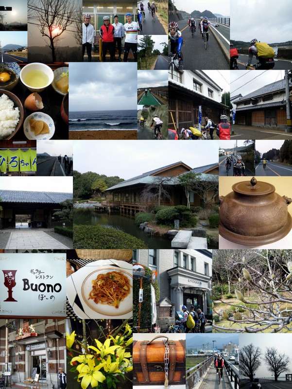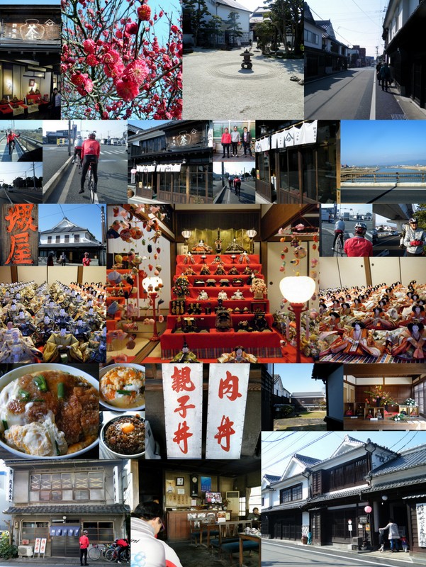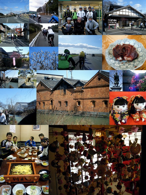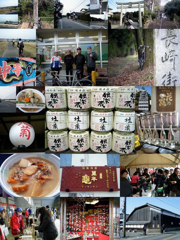 雛の里八女ぼんぼり祭に八女福島を散策。節句人形等の工芸、お茶のブレンドで八女茶を確立、伝統の日本酒、等々、伝統の技は半端じゃ無かったです。RIDE AND SMILEPR 平成26年2月16日(日曜日) 天候 快晴 距離 約72Km 最高高度 約62m 写真をダウンロードしたいこちら 江戸時代の三大酒処と言えば 京都伏見 兵庫灘 筑後城島 福岡県に伝統の酒処があるのに新酒を楽しまないなんて。そんな事で年に一度の城島酒蔵開きにサイクリングで行って来ました。 何時もの所に集合、定刻出発。外環状線を東に。国道112号線を進み筑紫神社で休憩。神社の境内は旧長崎街道。少し見学して鳥居を潜ると筑前原田宿。当時の面影は微妙に曲がった通りのみ。福岡のベットタウン化の波で古い建物は無くなり、案内の石碑があるのみです。原田を後に国道3号線へ出て直ぐの三国ヶ丘、コチラには江戸時代の三国の国境石が残っています。筑前国(福岡)肥前国(佐賀)対州国(対馬)当時、対馬は朝鮮との闇貿易で潤っており、この地に飛び地で領地を持っていました。境界石を見学して、道路の対面に渡ると、江戸時代の佇まいを残した石畳の並木道 旧長崎街道 が残っています。福岡で当時の姿を残しているのはココと北九州市黒崎の曲里の松並木と冷水峠ぐらいじゃないでしょうか。写真を撮って出発。国道3号線をひたすら南下。久留米市宮の陣 丸星中華そばセンターで腹ごしらえ。こちら中華そばというよりラーメンでしょ。以外におでんが好物だったりして。ラーメンがでてくるまでにペロリ。再出発。すぐに筑後川を渡り直に右折して河川敷のサイクリングロードへ。下流に向かって進み道が無くなる当りで川の側道へ。最後は泥濘に突っ込みウェアが泥だらけ。水天宮の当りで上るべきでした。失敗失敗。川沿いに進み筑後川大堰、天建寺大橋を過ぎると間もなく城島到着です。最初の酒蔵は「池亀」甘酒アイスを食べながら見学するつもりが大混雑でパス。次の蔵へ。脇道を抜けて通りを進み「万年亀」続いて「旭菊」こちら家族的もてなしの良い感じ。甘酒を頂いて三瀦駅横の「杜の蔵」へ。コチラに自転車はデポしてシャトルバスにて本会場へ行く算段。ここから心置きなくお酒が頂けます。運よく樽酒の鏡割り。無料で三杯生酒を頂き、粕汁でお腹も満たして本会場へ。バスから降りて「花の露」へ。ビックリ身動き取れず大渋滞。めげずに酒の泉に並びタダ酒ゲット。蔵を散策してお土産の生酒購入。疲れ果てて本会場は断念。バスで三潴駅まで戻りそのまま輪行で帰ってきました。 年に一度の城島酒蔵開き。蔵で新酒を味わい、輪行で帰って家でお土産の生酒を楽しみ2度美味しいサイクリングでした。RIDE AND DRINK AND SMILE !!! 平成26年2月11日(火曜日:建国記念日) 天候 快晴 距離 約140Km 最高高度 約69m サイクリングの 詳細はこちら 写真をダウンロードしたいこちら 2月と言えばひな祭り。そこで柳川のひな祭り「さげもん巡り」の開催中に街を散策して鰻の蒸篭を頂くサイクリングに出かけました。 放射冷却で一段と冷え込んだ朝です。今日は鰻に釣られて大所帯。定刻に出発です。外環状、通称5号線を経由して鳥栖筑紫野道路へ。ココから先頭交代しながら鳥栖へ。天気は晴天。サイクリング日和です。鳥栖から県道31号線を佐賀方向へ。綾部神社の喜久屋さんで名物の「ぼたもち」休憩。吉野ヶ里町から385号線で一路柳川を目指します。筑後川を渡ると久留米市城島の名産「鬼瓦」がお迎えしてくれます。ココから旧道を進むと、柳川が近づくにつれ水路が目に付いてきます。新道の先に有明海沿岸道路の高架が見えてきたら柳川市街到着です。柳川駅前から三柱神社を抜け掘割に沿って進むと、うなぎ蒸篭「川よし」さんに到着です。コチラ鰻が高騰していても質も量も犠牲にしていません。並の価格で特上の満足です。アリガトウ感謝です。腹も満たされ柳川散策です。まづ鶴味噌さんの並蔵。掘割の水路に煉瓦造りの倉庫が並ぶ景色は情緒があります。川下りのドンコ舟がココで進路変更します。写真を撮ろうと待ち構えていたのですが・・・今日は寒いので舟の観光は少ないようです。川下りコースに沿うように「水辺の散歩道」が整備されていますので、コチラで街を散策です。鰻の供養碑・初代筑後国主「田中吉政」の銅像・団一雄の詩碑・まちぼうけ(柳川出身の北原白秋の代表的作品)のモニュメント・この辺りの代表的漁法「くまて網」などなど水辺の景色を楽しみつつ進みました。最後に柳川藩の重鎮の隠宅「旧戸島家住宅」を見学。雛飾りとさげもん、お庭を見学して帰路に。帰りは国道3号線経由で日暮れ前には帰り着きました。 冬なれど小春日和の一日、柳川を舟の目線でサイクリング。さげもんに関するエトセトラ・・・家族が娘に託す思いを感じ、鰻の蒸篭も頂き、今日は柳川を味わい尽くしました。RIDE AND SMILE 平成26年2月2日(日曜日) 天候 曇り 後 晴れ 距離 約145Km 最高高度 約144m サイクリングの 詳細はこちら 写
